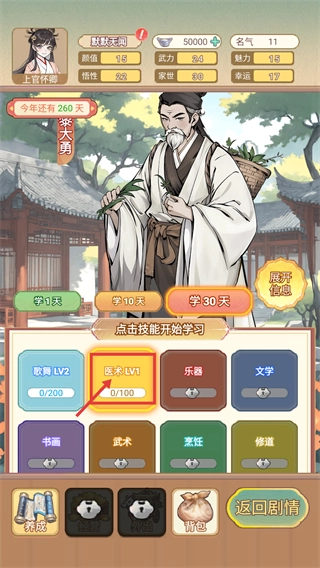 在养成界面解锁【医术-LV1-0/100】技能后,选定该技能并选择学习天数,即可推进医术技能的养成进度。