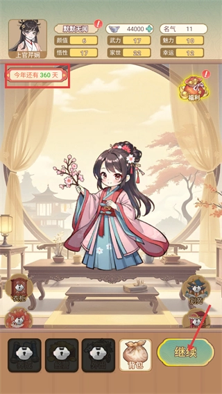当你处于当前界面时,请注意查看【今年还有-360天】的时间提示信息。你可以借助【衣柜】和【别苑】这两个功能进行互动,点击【继续】按钮就能推进游戏的流程。