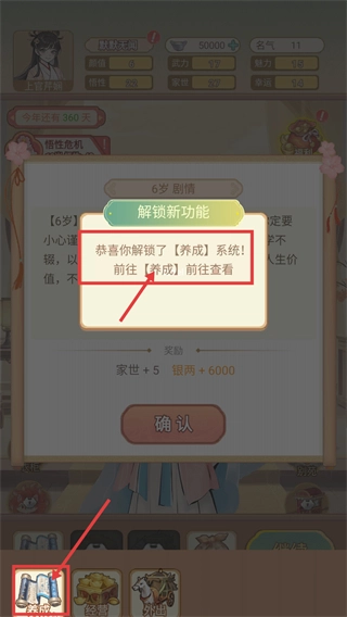 【6岁-剧情】开启【养成】系统,领取【家世+5】【银两+6000】的奖励后,点击【确认】按钮,再进入【养成】界面查看相关功能。