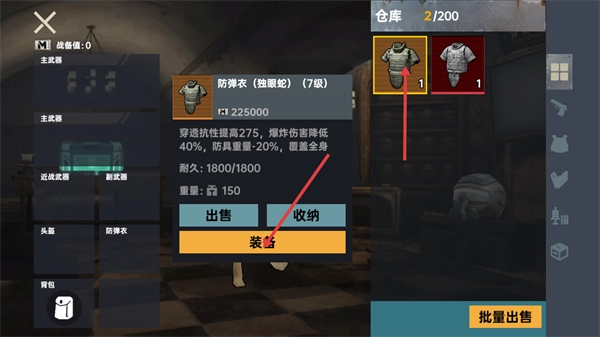 在仓库界面找到并选中【防弹衣-(独眼蛇)-(7级)】,这件防具具备穿透抗性提升275等属性,点击界面上的【装备】按钮就能完成穿戴操作。