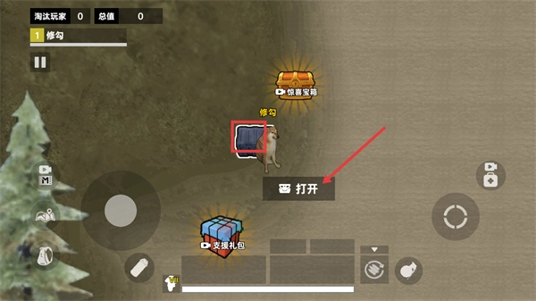在对战场景里找到【惊喜宝箱】,点击下方的【打开】按钮就能获取物资,另外也可以留意一下附近的【支援礼包】。