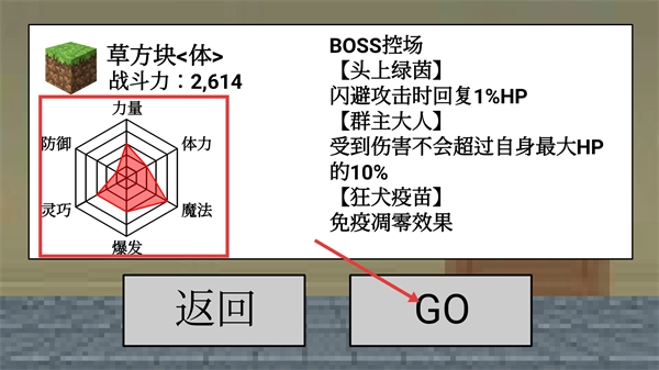 查看【草方块】的【头上绿茵】【群主大人】【狂犬疫苗】这几个技能的效果,在确认它的战斗力为-2614之后,点击【GO】按钮进入对战环节。