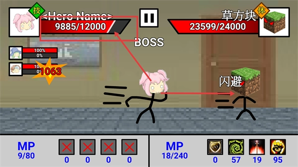 对战刚开始时,要留意【草方块】的【闪避】动作,同时关注自身血量(-9885/12000)和敌方血量(-23599/24000),对技能释放进行合理规划。