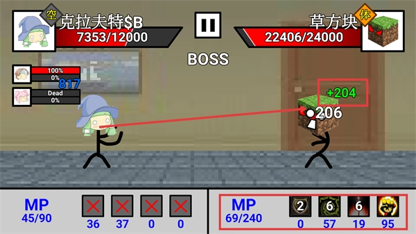 对战中期要留意【草方块】闪避后触发的【+204】回复效果,另外也要关注我方单位的存活情况以及双方MP数值的变动。