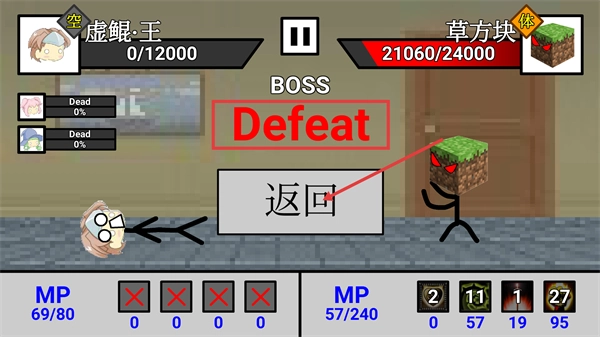 当屏幕上显示【Defeat】提示时,意味着本次对战未能获胜。这时你可以点击【返回】按钮离开对战界面,之后可以重新调整队伍阵容,再次发起挑战。