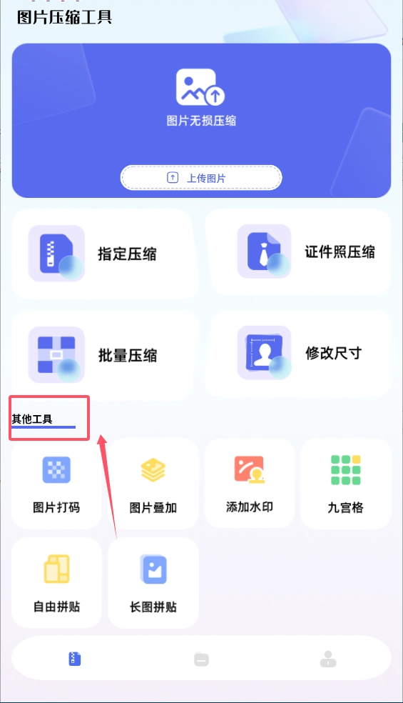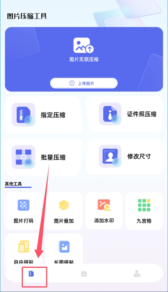 打开软件后,先查看顶部蓝色区域的“图片无损压缩”板块,其中间那个显眼的“上传图片”按钮便是入口。
