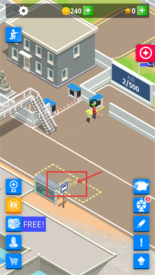 点击【公交站】区域可触发对应功能,当前【人口-2/500】,该设施的作用是引入新角色,另外要留意顶部【金币-240】等资源的剩余数量。
