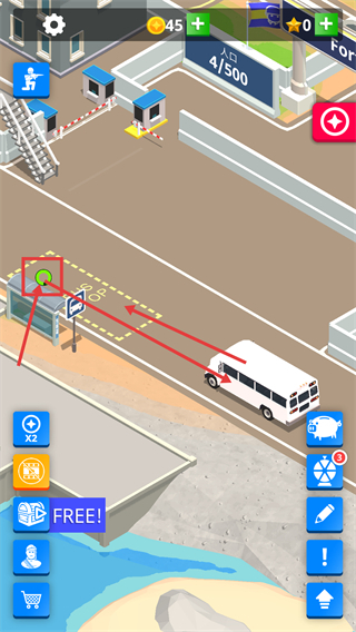 巴士到达后,点击【公交站】的交互标识,完成新兵接引流程。此时人口显示为【人口-4/500】,资源会同步更新,需要持续留意设施的状态变化。