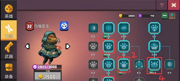 按照图中的顺序来加点,关键就一个原则——所有点数都加在伤害上。等1和2这两个部分都点满之后,你的输出能力会变得特别强悍。