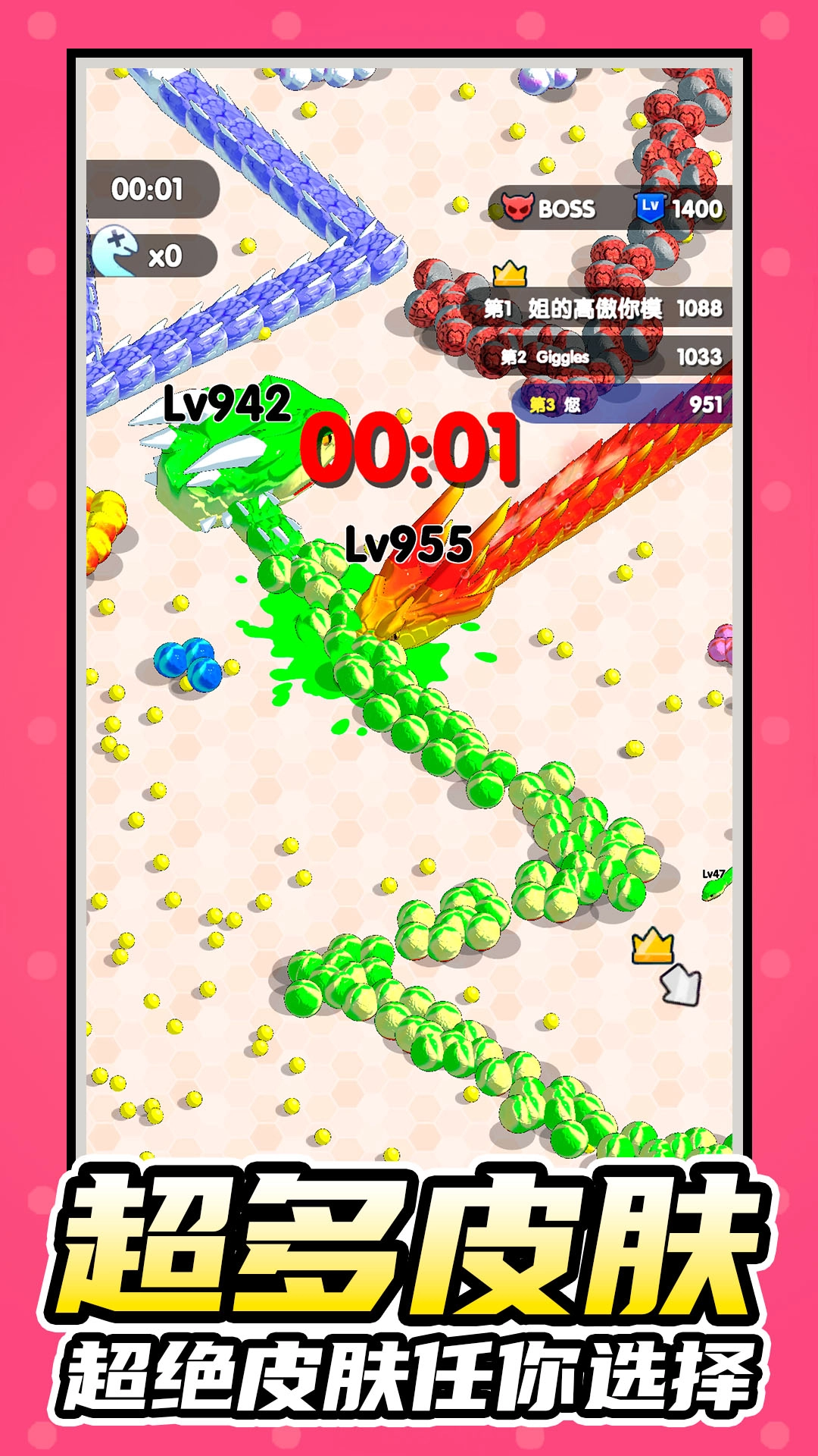 1、在田园、未来等多样化地图中,通过滑动屏幕操控小蛇收集散落元素,优先寻找稀有元素快速提升等级。