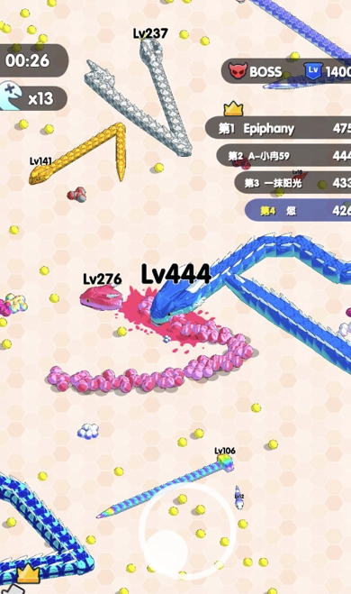 当小蛇撞到等级比自己低的其他小蛇时,能够直接把对方吞掉,同时获取对方的积分以及一部分成长值。