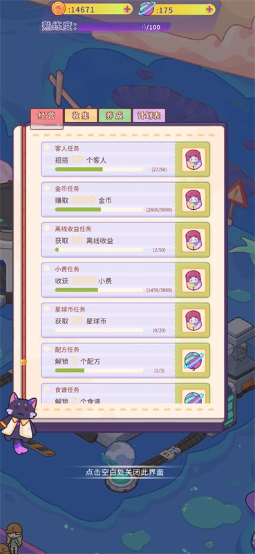 《星星异旅》的玩法轻松休闲,却不乏深度与趣味。你只需巧妙调整食谱中的配料,就能解锁通往不同世界的神秘地图。这些地图不仅场景各不相同,装饰风格也大相径庭,就连遇到的客人和精灵,都有着独一无二的个性与故事。每一次食谱的改变,都是一场全新的相遇,一次心灵的触动。