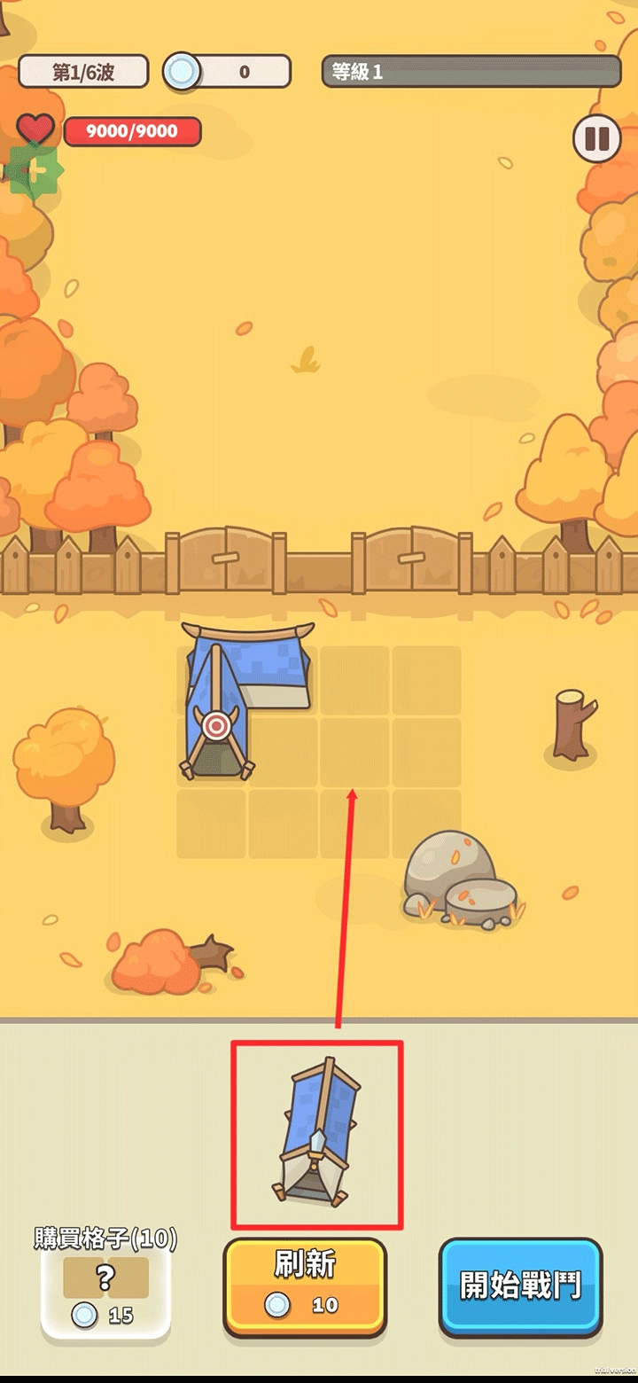 在战斗准备阶段,玩家需把下方的建筑拖放到指定格子里,完成布置后点击“开始战斗”即可。