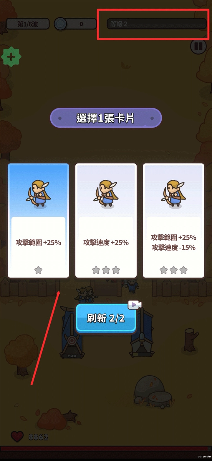 战斗开启后,建筑会自动派遣士兵与敌人展开对抗。当右上角的战斗等级每次提升时,玩家将得到一次抽取卡片的机会,这些卡片可以提供随机的增益效果或特殊能力。