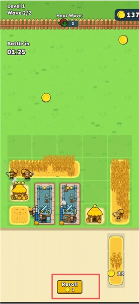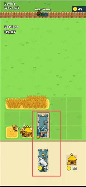 房屋放置好后,士兵和农民会自动出现。农民会去麦田收割小麦,小麦能自动变成金币。等金币攒到规定数量,就能解锁新的建筑,慢慢扩大你的领地范围。