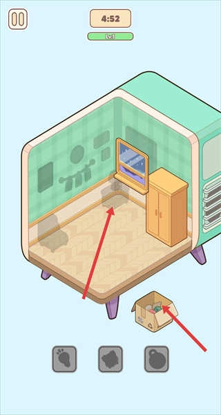 进入游戏后点击发光的纸箱就能开启房间布置环节,在5分钟倒计时内从箱子里获取家具,建议优先规划大件家具的摆放位置,以此奠定房间布局的基础。
