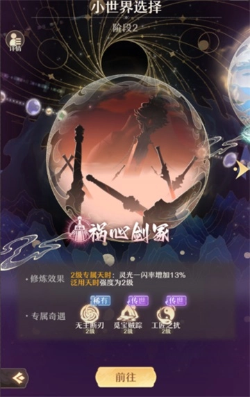 小世界能带来各异的修炼成效与更多奇遇事件,您可依据自身修炼需求进行挑选,像灵光一闪的概率、共鸣效率的提升等方面都可供选择。