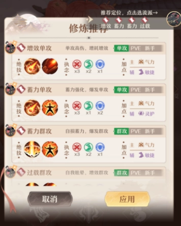 接下来御境大人就要为弟子选定职业流派了。职业选择至关重要,刚接触的御境大人不妨优先考虑那些数值百分比加成较高的流派。