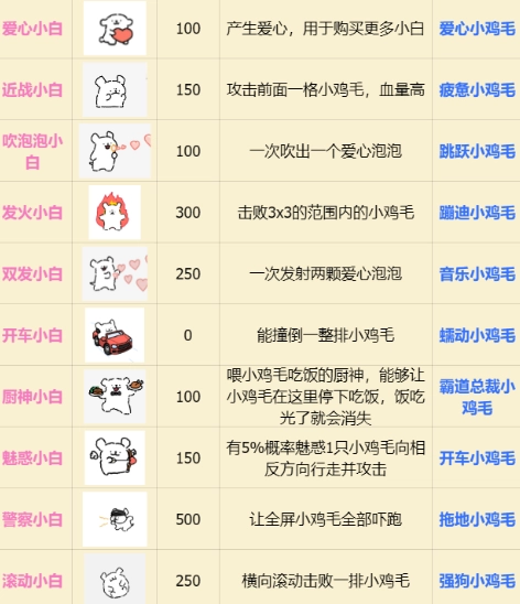 魅惑小白:存在5%的概率魅惑一只小鸡毛,使其朝着相反方向移动并发起攻击