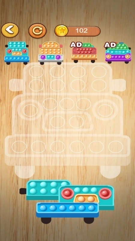 1、拖动彩色汽车模块,放入对应轮廓空位,拼完整造型,解锁新车辆与关卡。