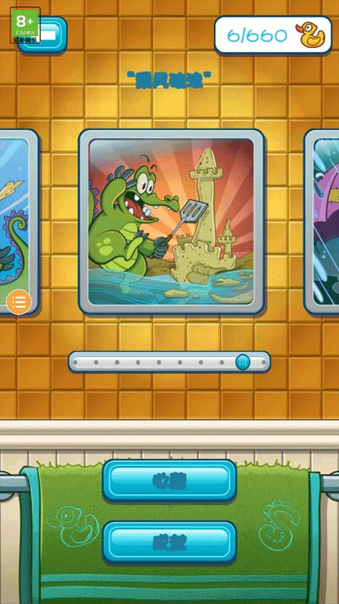 在大部分关卡里,玩家只要垂直向下拖动,持续拖动就能看到下方有一只小鳄鱼在来回游动。