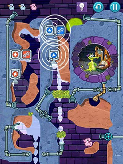 2、本关第一步要划开通往上方那只鸭子的路径,接着打开红色水闸开关。之后泥浆接触到青草就会变成石头。