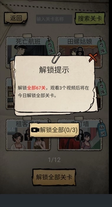 3、关卡闯关中存在未解锁的关卡,解锁提示如下:若要解锁全部67关,观看3个视频后,今日内即可解锁所有关卡。