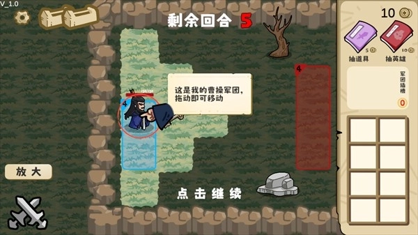 3、正式开始后,角色左上角的数字表示本回合的行动次数上限,游戏右上角可进行道具与英雄的抽取操作,下方的方块区域则是物品栏。