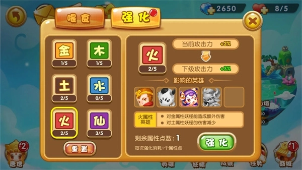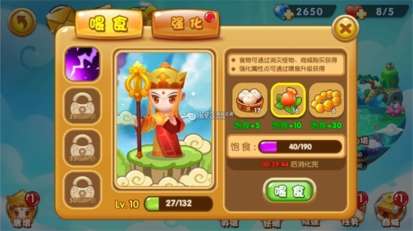 在挑战过程中,给唐僧喂食可以持续提升他的属性。需要注意的是,这部作品里每个角色都有各自对应的属性,你可以进入强化界面来增强自己英雄的属性。此外,蟠桃能够通过打怪获取,在关卡中,你得在拥有蟠桃时释放强力的必杀技。
