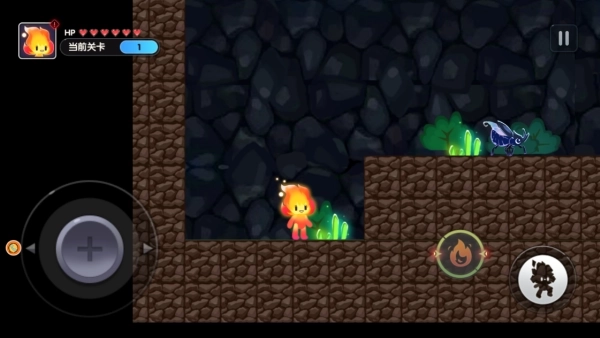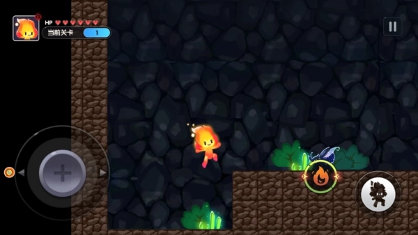 3.控制火人进行闯关。通过左侧的虚拟摇杆来操控角色移动,右侧的按钮则分别负责攻击和跳跃操作。