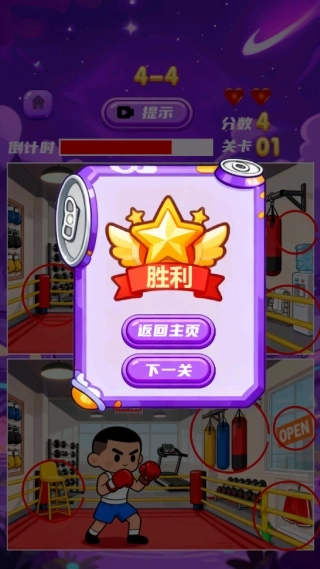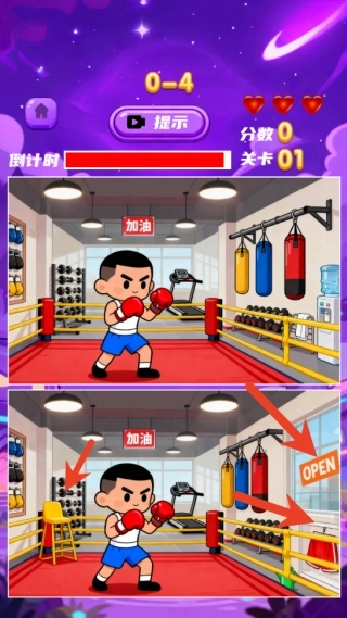 2、在关卡里认真比对左右两张相近的拳击场景图片,从人物动作、场地细节到背景装饰,全方位地查找差异。