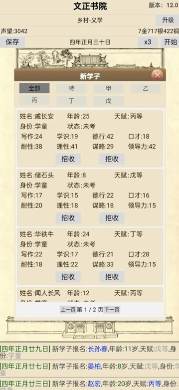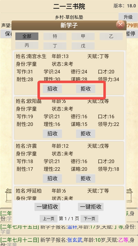 1、每年春季、夏季都会招生,玩家需要到招生办招收资质合适的学子,资质不好的可以拒收。