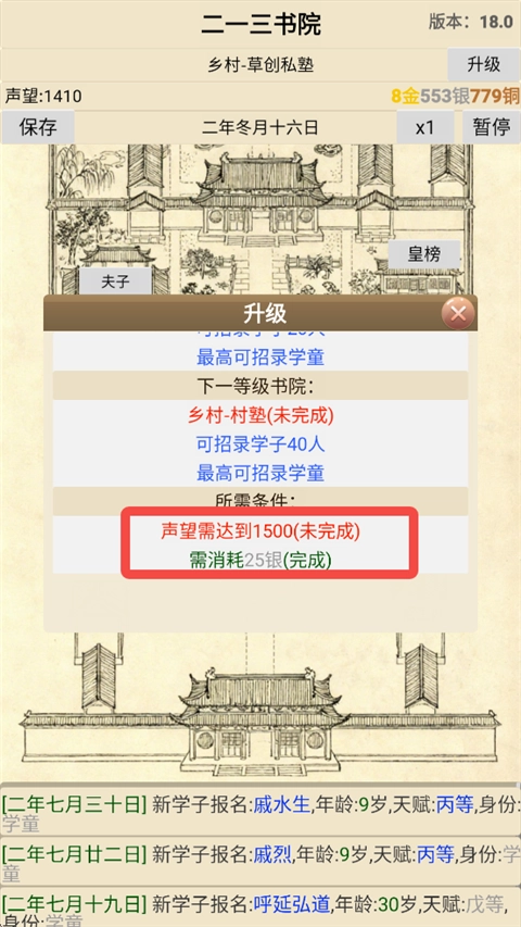 10、玩家可以查看升级到下一等级书院需要达到的条件。