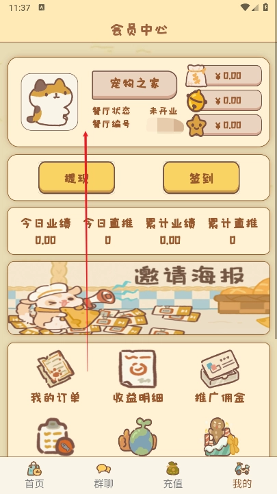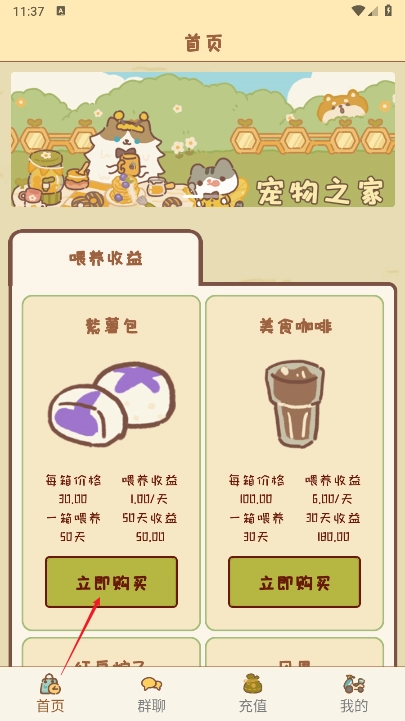 注册赠送宠物猫,通过每天喂养猫粮获得宠物收益。(通过菜谱里边购买猫粮喂养)