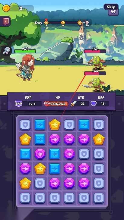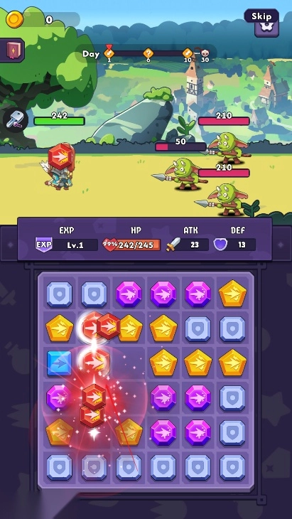 创新益智战斗模式:动态6x6网格上的滑动连接玩法独具巧思,箭矢、闪电、毒箭等不同元素的匹配可直接转化为战斗资源,使消除过程与战斗深度绑定,每一步操作都关乎战局变化,策略乐趣十足。