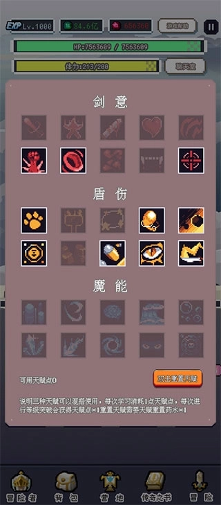 三种天赋支持混搭使用,每次学习需消耗1点天赋点;每次完成等级突破可获得1点天赋点;重置天赋时需要消耗1瓶天赋重置药水,若对当前配置不满意,也可以通过双击操作来重置天赋。