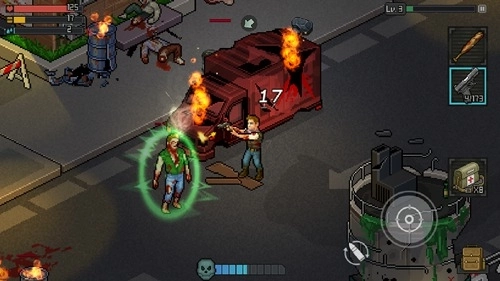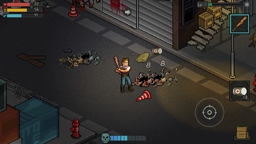 1、进入游戏后,我们能在地面上捡到一根棒球棍,这便是我们的初始武器,直接点击屏幕左下角的攻击按钮,就能自动攻击自身周围的僵尸。