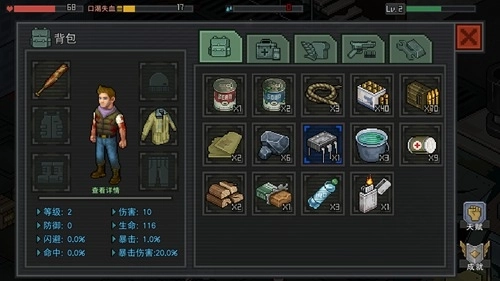 5、点击屏幕右下角的背包,就能查看自己拥有的材料和资源,其中包括各类食物、水、血包等生存必备物品,还有绳子、子弹、布料、打火机之类的道具。