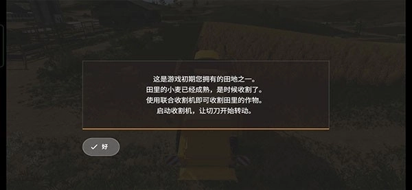 正式进入游戏后,映入眼帘的便是你的首个农场。首先迎来的是收割任务,能看到一片成熟的麦田与一台纽荷兰(newholland)收割机,各功能图标的含义详见下图:
