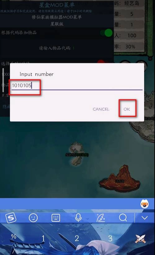 5、这里以物品聚灵丹为例,输入代码“1010105”,点击右下角的OK。