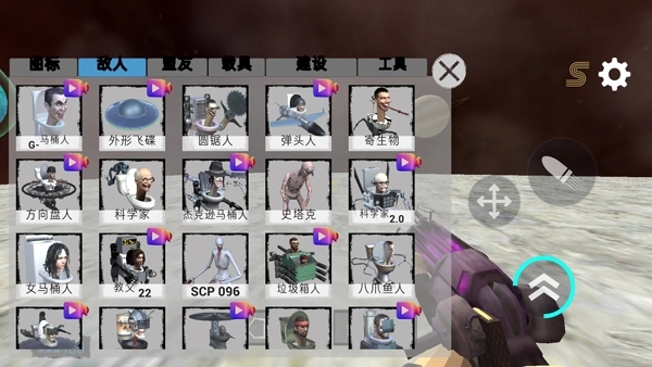 3、点击左侧的箱子按钮后,玩家就能挑选想要添加的敌人,像马桶人、圆锯人、弹头人、寄生物、外星飞碟这类都可以选择;