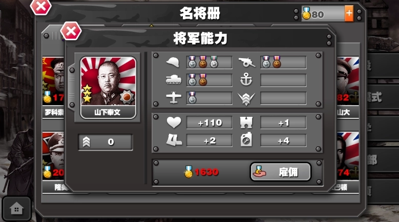 3、山下奉文是步兵路线首选的非氪金将领,和阿瑟比起来生存能力更占优势。在这个游戏里步兵单位大多比较脆弱,要是碰到敌方重坦指挥官,编队规模小的话很容易一下子就被消灭。但如果有总统这类全能型将领,就不用太依赖步兵体系了。