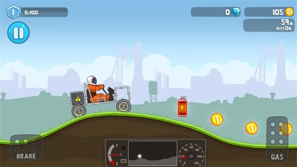 3、在行驶的过程里,你可以收集那些散落着的金币和燃油箱,积累得越多,能获得的奖励就会越丰厚,不过一定要留意燃料条的状态,一旦燃料耗尽,任务就会失败。