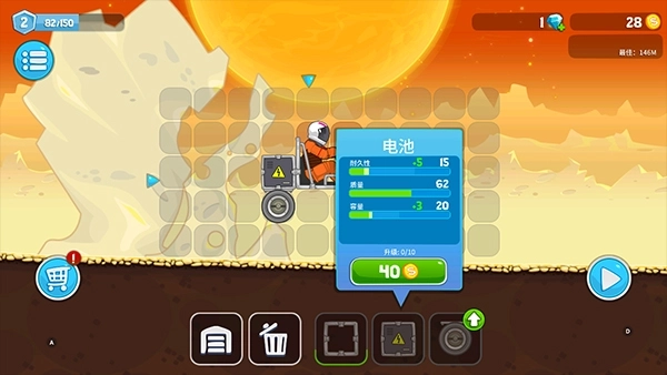 操作方式直观易上手:屏幕左下角是倒车键,右下角为前进油门,通过双键配合就能实现精准移动与重心调节。在颠簸崎岖的赛道上灵活闪避障碍物,是生存的关键所在。每通过一关都能赢得金币奖励,这些金币可用来购买新型零件,自由组装专属于自己的座驾。不断升级发动机、悬挂系统和轮胎性能,打造出一辆性能卓越、外观炫酷的星际越野之王,助力你在更遥远的星球表面驰骋前行。