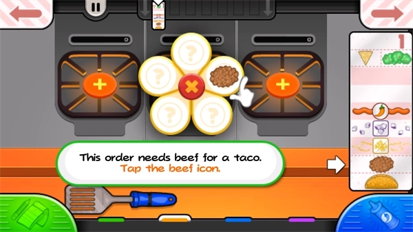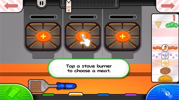 4、点击商店区域就能进入操作界面,底部有三大功能区:点餐台承担接单任务,烤炉台用来加热肉品,制作台是组装鸡肉卷的核心区域。