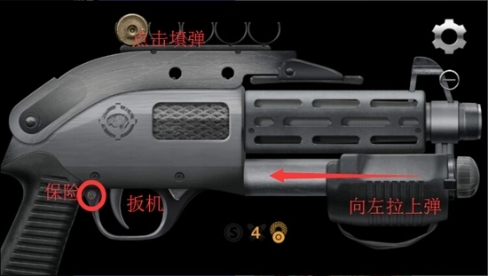 5、霰弹枪:装填时需遵循特定顺序,一开始最多只能装入4发子弹;只有拉动枪栓完成上膛操作后,才能填入第5发子弹。另外,点击枪身后部的按钮可以展开折叠枪托,当枪托处于展开状态时,会激活无限弹药模式,这样更方便练习速射技巧。