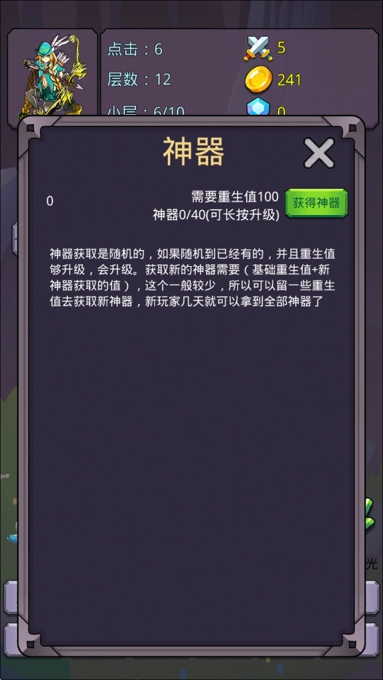 目前游戏内共有11个神器,它们大致分为两类:一类是战力型神器,像“暴打挂机神器”,能提升自动攻击力;另一类则是功能性神器,例如跳关神器。对于萌新玩家,建议前期优先升级战力相关的神器,比如增加攻击力、提升金币获取效率、提高10倍金币触发几率,以及减少英雄升级费用的类型。等后期战力提升、通关数量增多后,再考虑升级跳关神器——这类神器在后期也会变得尤为重要。