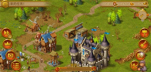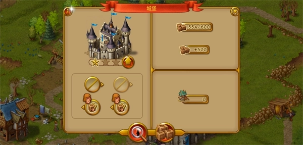 2、进入某个场景游戏后,映入眼帘的会是一座宏伟的城堡,以及若干小房子、伐木小屋之类的建筑。其中,小房子是用来提供人口的,只有人口增加了,才能开展各项劳作。