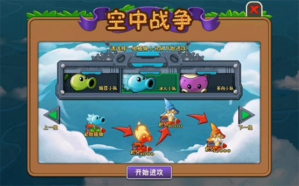 在你开启天空关卡16天之后,就能挑选三种不同类型的植物了。我给大家推荐的是冰火小队这个组合。这一关中共有四种植物,当你达到对应的分数时,你的植物就会自动升级。要尽量避免漏掉僵尸,要是漏掉的僵尸太多,就会因为分数不足而没法通关。这一点大家可得留意一下。