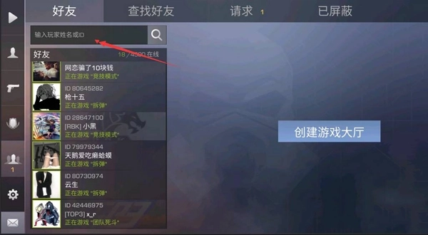 适合大家添加线下的小伙伴为好友时使用。由于对峙2中玩家彼此的ID是不会出现重复的,因此我们只需要记住小伙伴的名字或者数字ID,然后同样点击主界面右上角的标志为两个人的按钮,选择ID搜索并输入小伙伴的名字即可。